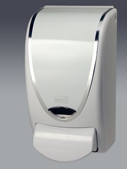 LARGE EASY PUSH BUTTONS THAT DISPENSE A CONTRILLED DOSE OF SOAP TO PREVENT WASTE.
